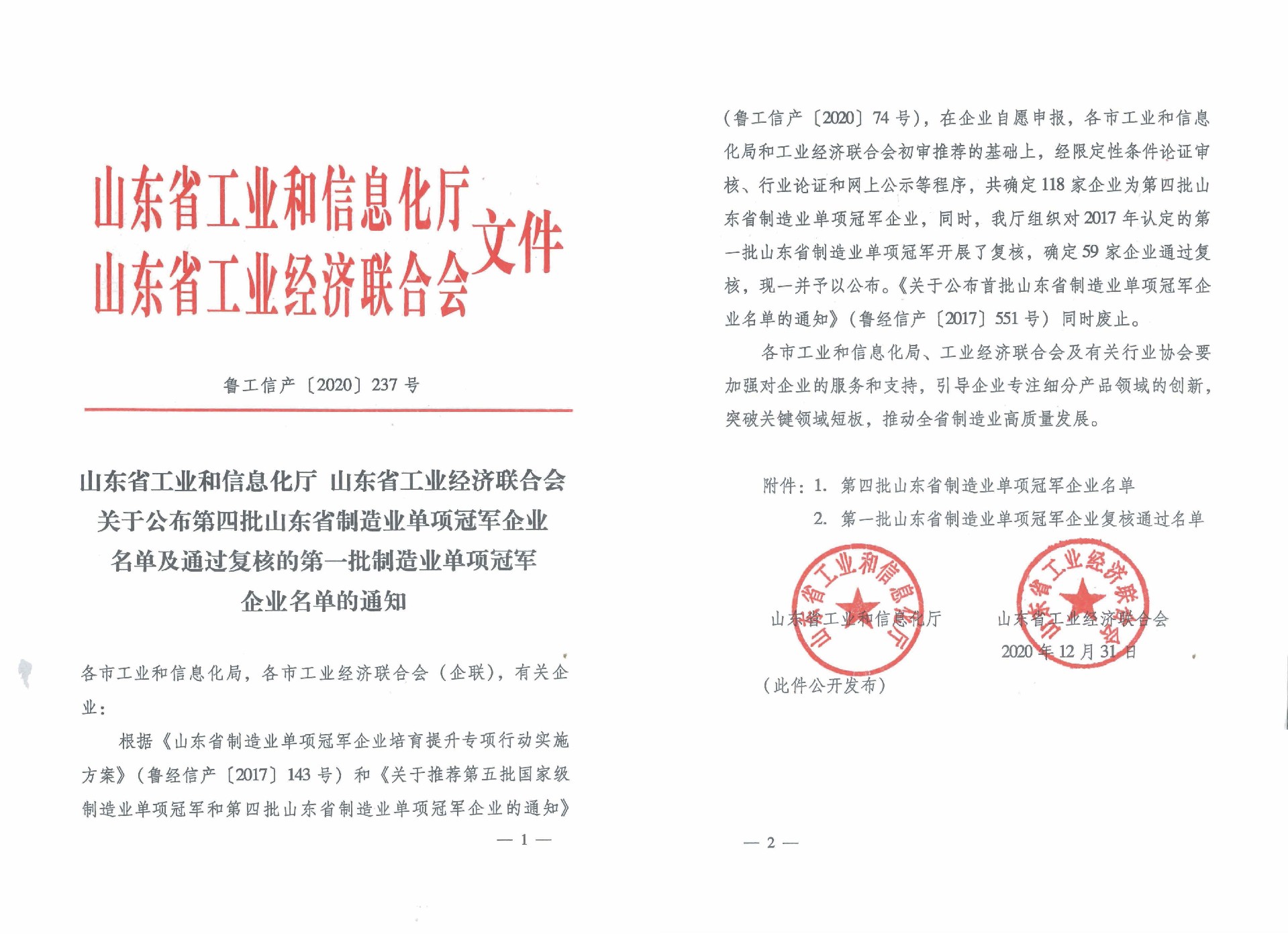 制造業(yè)單項(xiàng)冠軍企業(yè)是指長期專注于制造業(yè)某些特定細(xì)分產(chǎn)品市場,生產(chǎn)技術(shù)或工藝國際領(lǐng)先,單項(xiàng)產(chǎn)品市場占有率位居全球前列的企業(yè)。此項(xiàng)榮譽(yù)是山東省對(duì)我司產(chǎn)品研發(fā)實(shí)力和對(duì)核心產(chǎn)品技術(shù)開拓進(jìn)取、攻堅(jiān)克難的實(shí)力認(rèn)可,同時(shí)也是對(duì)我司上下一致、刻苦鉆研、積極創(chuàng)新精神的肯定。